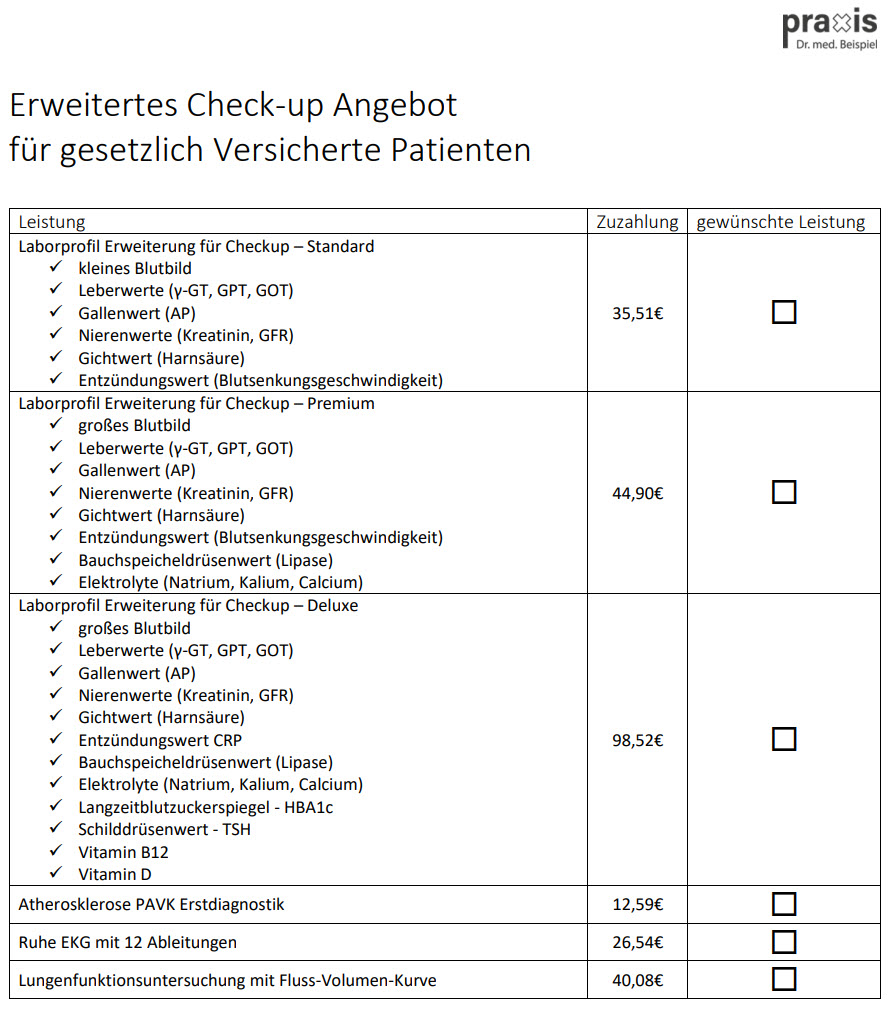 Bei dem Check-up 35 der gesetzlichen Krankenkassen handelt es sich um eine Untersuchung, mit begrenzter Aussagekraft. Aus diesem Grund biete ich Ihnen die erweiterte Labordiagnostik als Ergänzung an. Sie können zwischen den folgenden drei Erweiterung wählen.